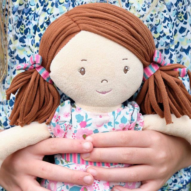 Katy features soft dark brown hair, embroidered facial details, and a charming pink and sea green dress that adds colour and personality. Her friendly expression and huggable 40cm size make her ideal for children to hold, cuddle, and carry wherever they go, helping to create a sense of comfort and familiarity.