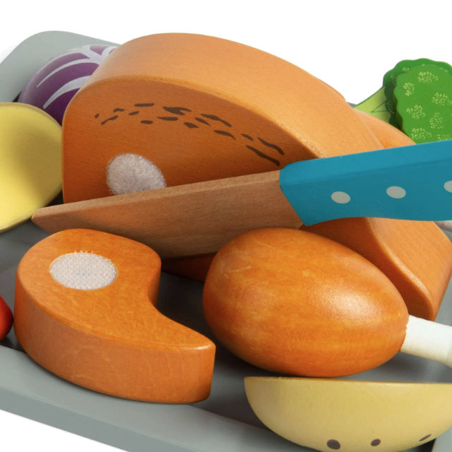 The set is made from solid, smooth-finished wood, giving each food piece a realistic weight and durable feel that enhances tactile engagement. The sturdy wooden construction makes the pieces easy for small hands to grasp, arrange, and serve, supporting the development of fine motor skills and hand-eye coordination. Painted details using child-safe, non-toxic paints add visual appeal while keeping the design simple and timeless.