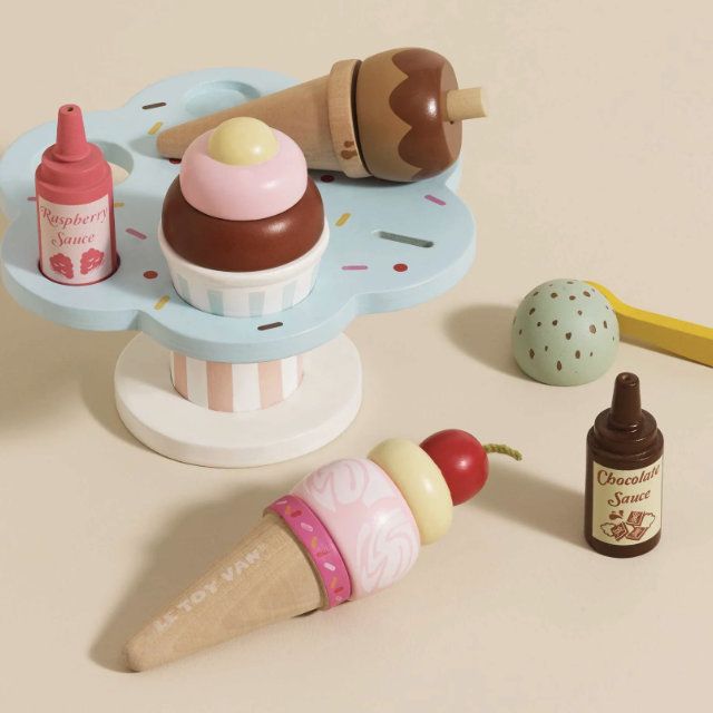 Serve up sweet treats with the Le Toy Van Ice Cream Stand & Topping Set - a beautifully crafted wooden play set designed for hours of imaginative fun. With its charming stand, colourful scoops, and delicious toppings, little ones can create their own pretend ice cream shop at home.