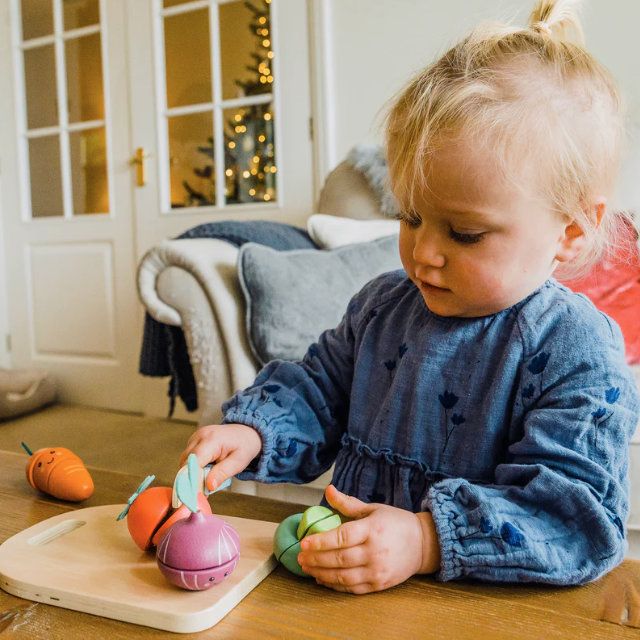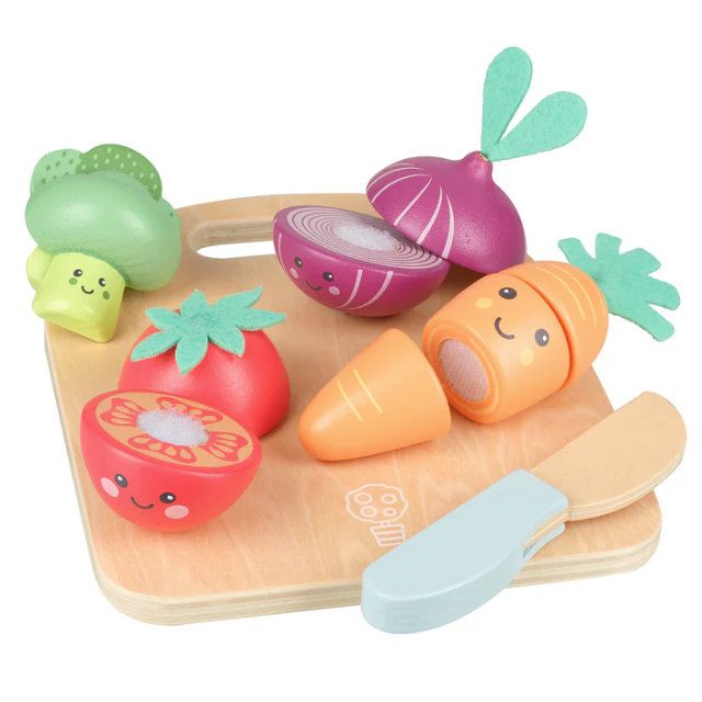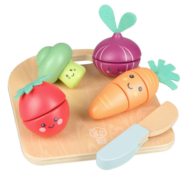 - Wooden vegetable play food set with Velcro cutting feature