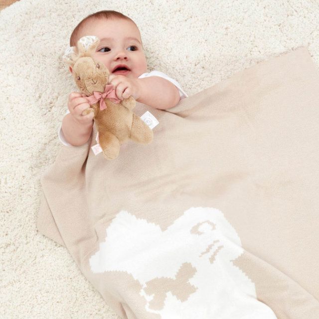 The knitted blanket features a gentle texture that feels soft against delicate skin, making it ideal for cuddles, naps, and quiet moments. Perfect for use in the pram, cot, or during story time, it offers warmth and reassurance while adding a touch of classic style to any nursery.