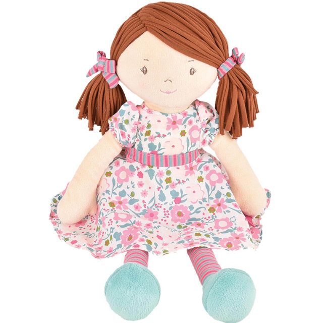 Katy features soft dark brown hair, embroidered facial details, and a charming pink and sea green dress that adds colour and personality. Her friendly expression and huggable 40cm size make her ideal for children to hold, cuddle, and carry wherever they go, helping to create a sense of comfort and familiarity.