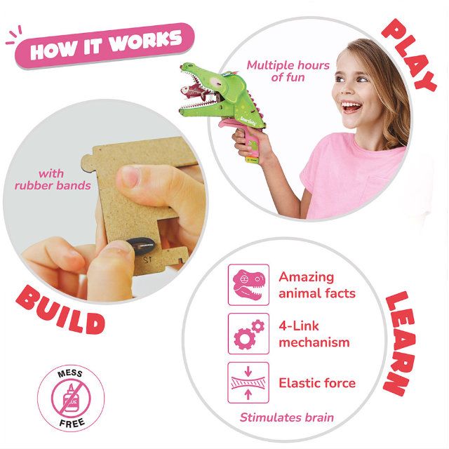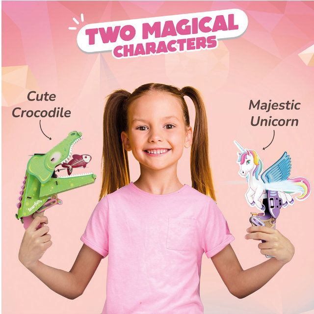 The kit requires no glue, tools, or batteries, making it a safe, mess-free way for kids to explore hands-on learning. Once complete, the crocodile and unicorn aren’t just models—they’re characters for hours of imaginative play, encouraging storytelling as well as STEM discovery.