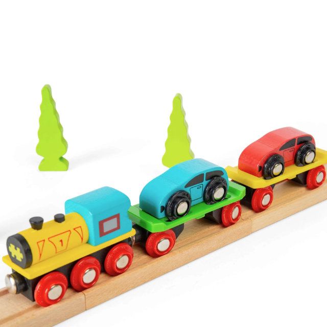 Compatible with most wooden railway track systems, the Car Loader Train fits seamlessly into existing wooden train layouts. The smooth-rolling wheels ensure reliable movement along tracks, while magnetic couplings make it easy for little hands to attach and detach wagons. The included cars can be loaded and unloaded, adding an extra layer of hands-on play and encouraging coordination and fine motor skill development. Crafted from high-quality, responsibly sourced materials, this durable wooden train meets all required safety standards and is built for long-lasting use.