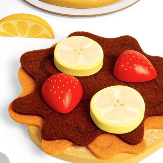 The pancakes and accessories are made from solid, smooth-finished wood, giving them a realistic weight and durable feel that enhances tactile engagement and supports fine motor development. Complementing the wooden elements are soft felt food pieces, which add texture and flexibility to play. These felt components make stacking, layering, and serving more interactive, encouraging careful hand movements, creativity, and sensory exploration.