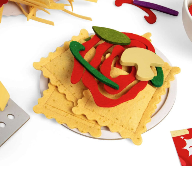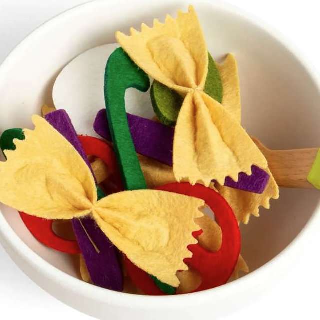 The set features a combination of solid wooden components and soft felt food pieces, creating a rich and engaging sensory experience. The wooden plate and accessories provide durability and a realistic weight, helping children develop fine motor skills and coordination as they serve and arrange meals. The felt pasta elements add texture and flexibility, making the play experience more interactive and lifelike while encouraging careful handling and imaginative assembly.