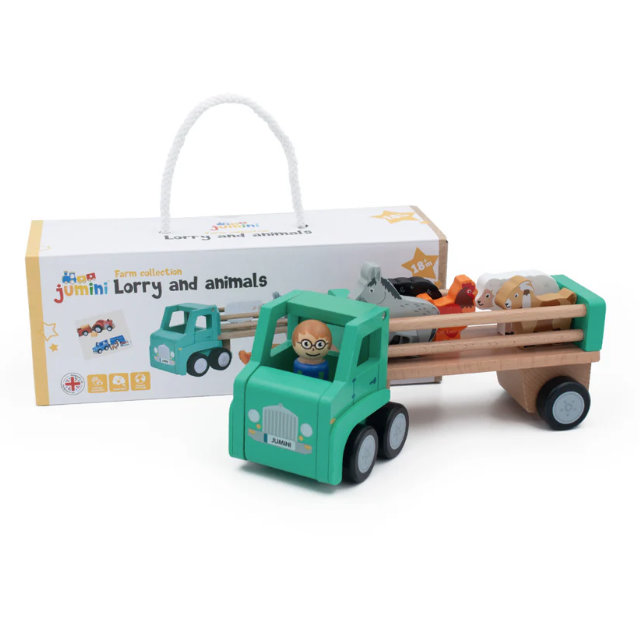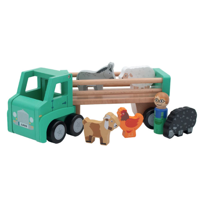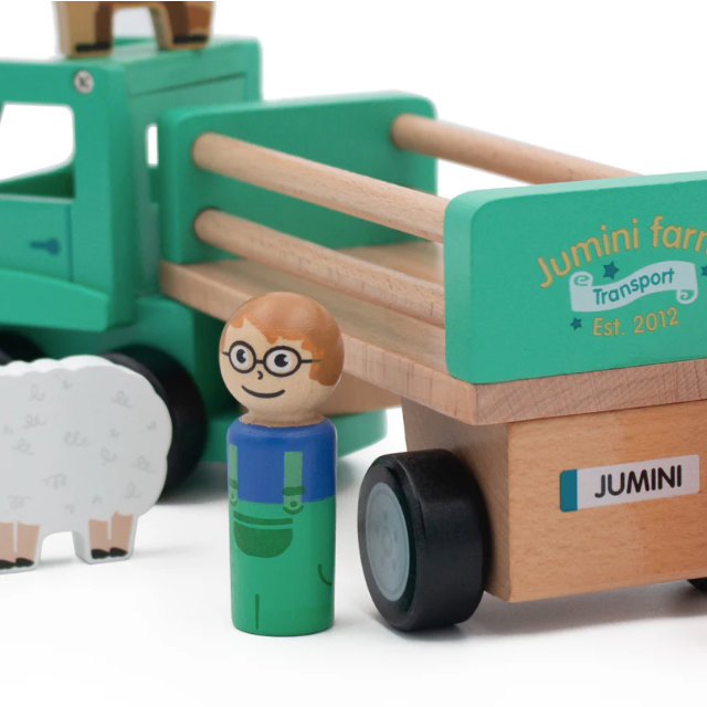 The Jumini Farm Lorry with Animals is a colourful wooden toy set designed to bring farmyard adventures to life. This charming lorry comes complete with a selection of chunky wooden animals, allowing children to load, transport, and unload their farm friends while enjoying imaginative play.